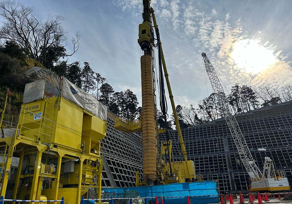 SMW工法を用いた業務。SMW工法とは、土(SOIL)とセメントを混合攪拌(MIXING)し、地中に造成する壁体(WALL)の略称です。大型の重機を使用して高層ビルの山留壁やダムの止水壁などを造成します。完成された建造物には見えてこない、しかし見えない土台を作る事に職人の誇りを持って挑んでいます。
